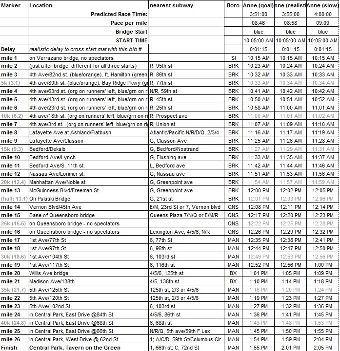 Of course, PR or no PR, the clock will still play an important role for me tomorrow, and that’s knowing what time I can expect to see my personal spectators along the course. New York Road Runners recommends downloading the free 2013 ING New York City Marathon Mobile App and tracking me that way (Bib No. 21-701), but I’ve also put together this little cheat sheet to help you out. The three columns represent my estimated time at each mile marker if I ran my goal pace (left), my medium pace (middle) or my likely pace (right). May I recommend downloading it, making a paper airplane and throwing it at me as I hobble past?