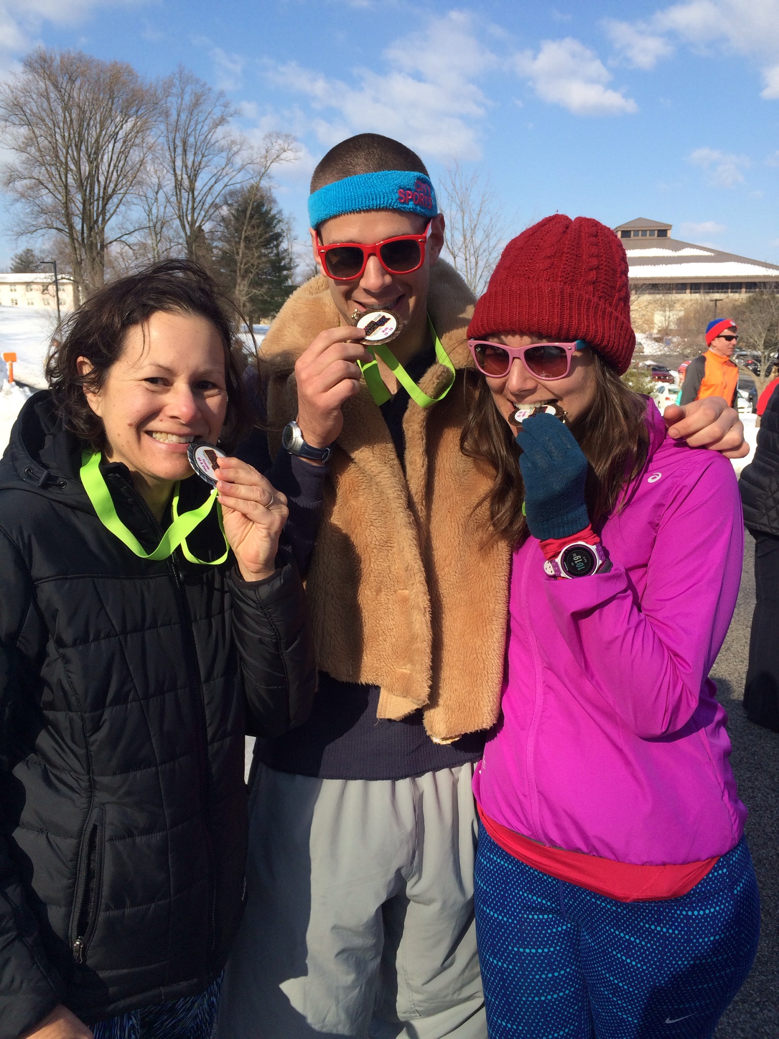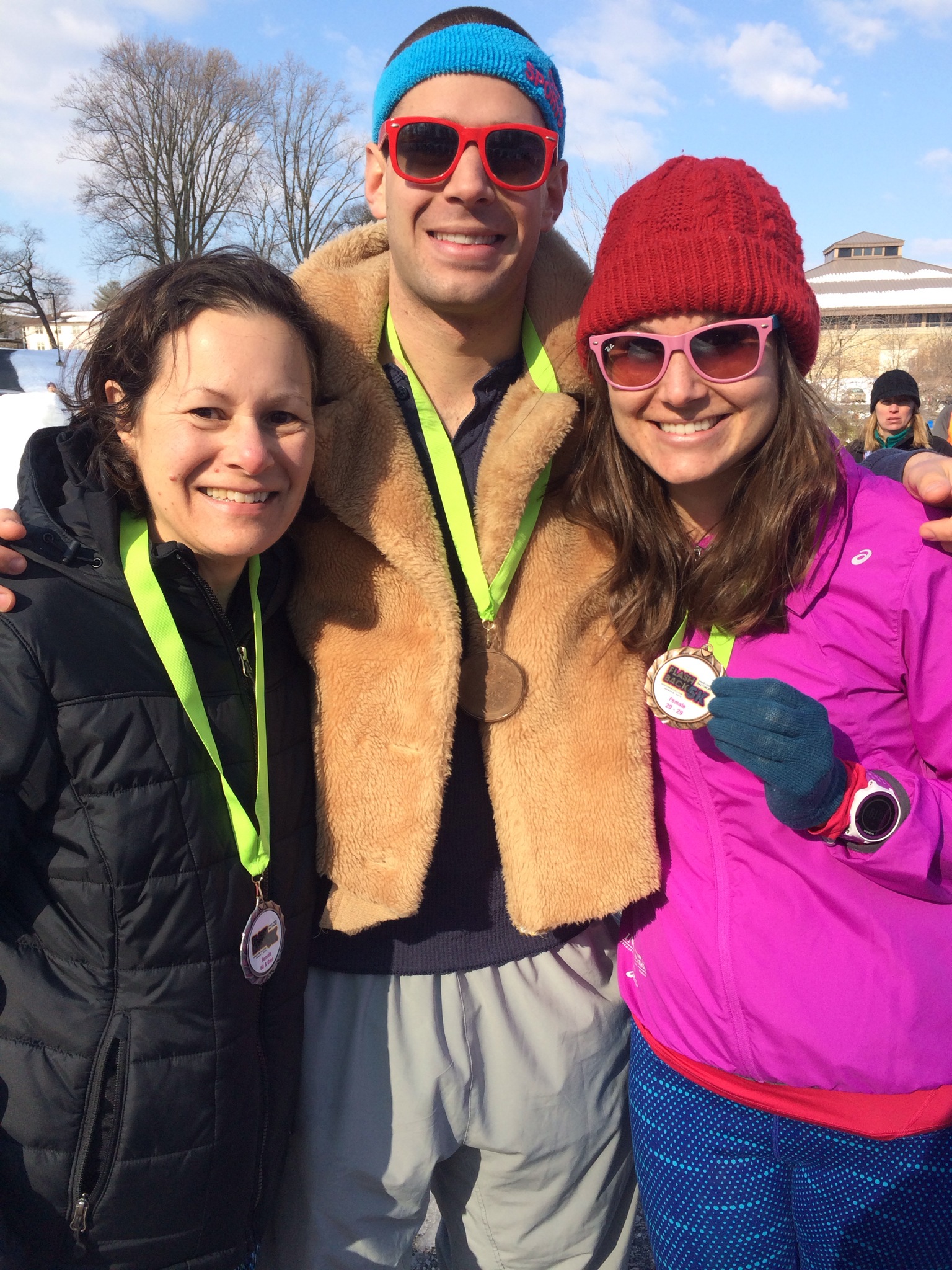 Undeterred by the foot of snow on the ground or the cruelty of spring daylight savings time, we donned our best neon heat gear this morning and made our way to Goucher College for the 9 am (ahem, 8 am) start time. Within minutes, all 92 (!) registered runners were lined up at the starting line, and with a blast of the airhorn, we were off.