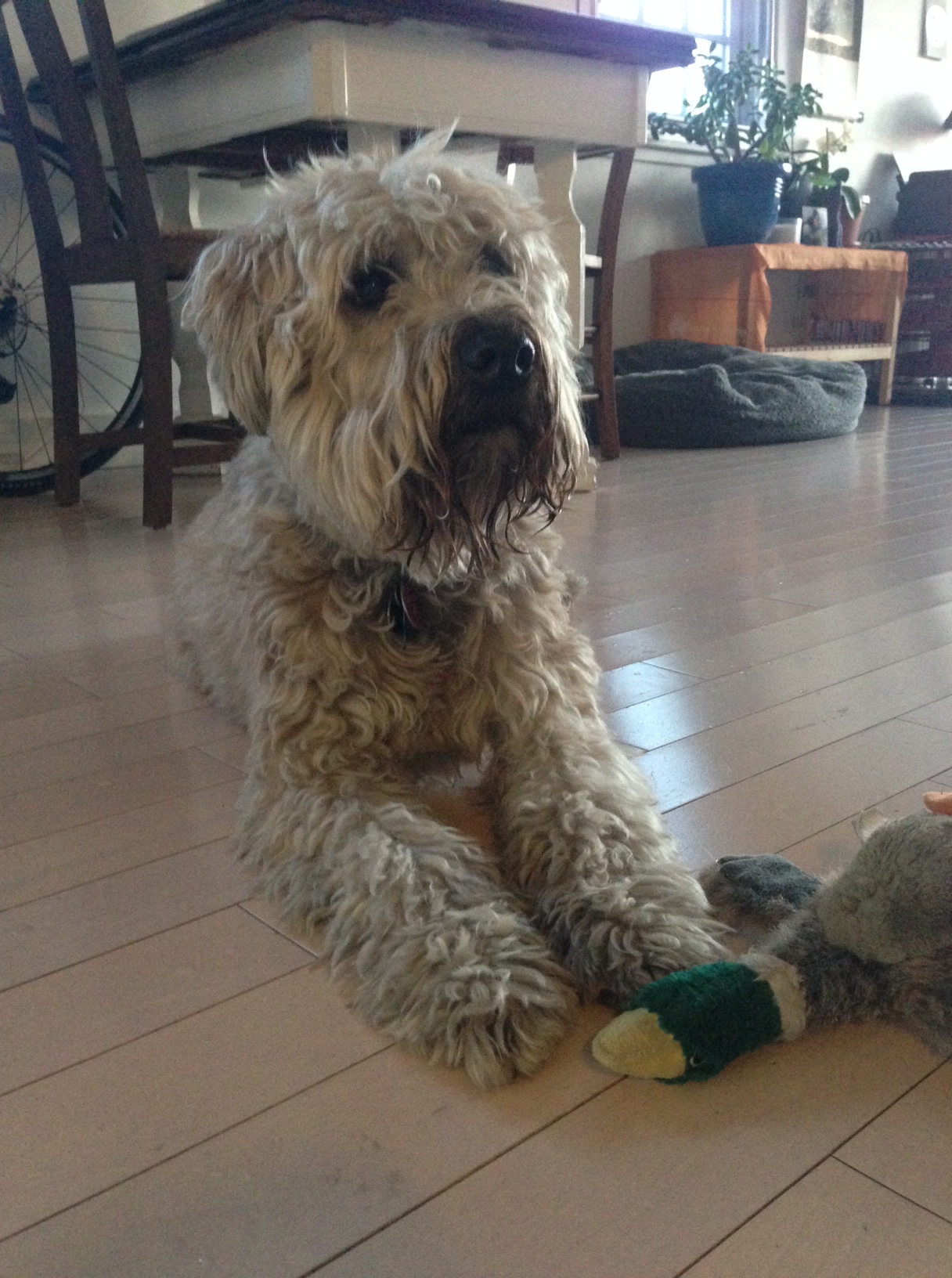 • Chia seed pudding (chia soaked in dark chocolate soy milk) with a sliced pear for 18 grams fiber, 13 grams protein and one delightful day of finding chia seeds hidden in your teeth for hours on end. I ate it before I remembered to take a picture, so here’s a photo of a wheaten terrier — not Keira — I dogsat last weekend instead. You’re welcome.