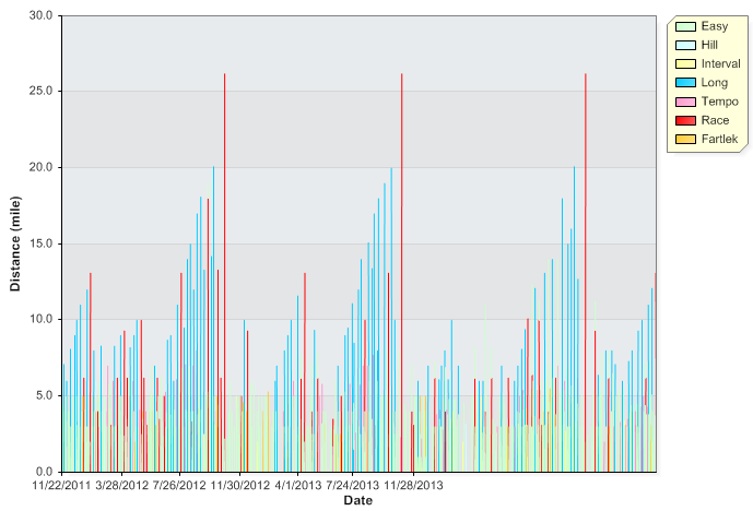 I imagine there exist other online training logs full of bells and whistles, but a one-man band I am not, and the Runner’s World Training Log was exactly everything I needed as a semi-serious runner looking to measure her progress. It let me record the type of workout I was doing, from fartleks to races, so I could see whether I was getting enough speed work in. It helped me keep track of my ever rotating arsenal of Asics so I’d know when each pair was pushing 400 miles and was ready for retirement. It allowed me to reflect back on all three marathon cycles after the fact, and marvel and the peaks and troughs a year of training can bring.