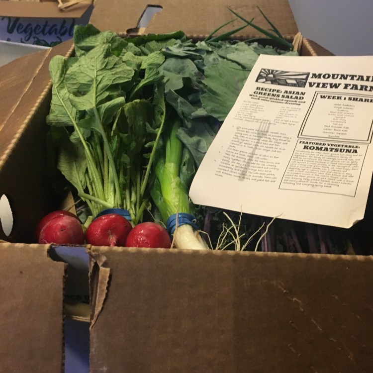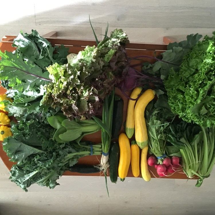 The first pick-up was this past Tuesday, and OH THE BOUNTY. It’s still spring, and that means mostly greens for now. We had several things I recognized, like head lettuce and bok choy and scallions and kale, but also some things I definitely had to google, like tatsoi.