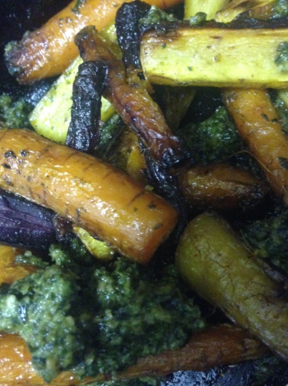 I realized that for all those years, I had been eating carrots wrong. They weren’t best experienced as a token raw crunch or as an obligatory floating mass in a chicken noodle soup — they were made to be roasted. And so I started roasting them, and in mass quantities. I experimented with a lot of combinations, but my favorite was an homage to ol’ Bobby himself: tossed in olive oil and sea salt, roasted at a high temp until nearly blackened, tossed with pesto and adorned with a dollop of Greek yogurt. Pure bliss.